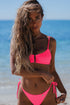Las telas texturadas de color liso pueden desteñir y perder intensidad con el uso, la exposición al sol y los químicos de las piletas. Evitar el contacto de la bikini húmeda con otras prendas y el roce de la misma con superficies ásperas para no dañar la lycra.